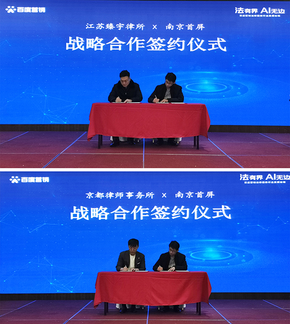 在多年的發(fā)展中,離不開廣大法律服務行業(yè)客戶的信任與支持,會上南京首屏與江蘇臻宇律所、京都律師事務所簽訂戰(zhàn)略合作協(xié)議,借助百度平臺推動律所的創(chuàng)新式營銷能力,促進法律服務行業(yè)的發(fā)展。